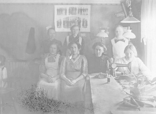Bildtext: Not. vid foto: Fr. v. 3. Stuggens Marta Olsdotter, som startade damskrädderi och affär i Ede 1903, omgiven av några sömmerskor. 1. Hennes syster Erskers Karin har som en av ytters få kvinnor angetts med yrke i släktregistret - sömmerska. Vi känner henne som tröjstickerska. 2. Anna Strandberg, gift med skräddaren Sigurd Lundgren och bl. a. mor till Olle Lundgren. 4. Troligen Anna Kron Sandberg. Artikel i HT-1978-06-02 sökord: kvinnor, sömmerskor motivkategori: Arbete id:10668 Fotograf: Rudolphi, Delsbo fotoår: bildnummer: MER-275 förening: Delsbo Hembygdsförening land: SE motivplats: Gävleborg, Hudiksvall, Delsbo teknik: 10,1 x 15,9 cm, skannad påsiktsbild, 16-bitars gråskala, 600 ppi rättighet:(föreningen ovan om ej annat anges.) Delsbo Hembygdsförening originalplats: (visas ej publikt) släktboken: publiceras: ja säljas: tidigare nr: samling: (MER) Margareta (X) Eriksson skick: reg av: BF/Delsbo, 0653-104 59, 073-044 82 03 reg datum: 2025-08-20 |