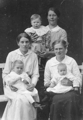 Bildtext: Kort från (JG) Jonas Gustaf Baggströms (1874-1963) 75-års dag 1949. Barn,sonhustrur, mågar och barnbarn samlade på trappan i Haga. Övre raden: Valborg Baggström (Gösta) Elin Baggström, Anna Baggström, Märta Baggström (Axel), Axel Baggström, Lasse Hellström (Signe), Gösta Baggström. Mellanraden: Martin Johannisson,(Kristina) Catarina Johannisson, Kristina Johannisson JG, Karin Baggström Erik Baggström. Barnen: Eva Baggström, Jonny Baggström, Sune Baggström, Bertil Baggström,Kerstin Hellström, Birgitta Baggström och Ulla Baggström
