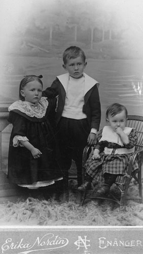 Bildtext: Från en bröllopsfest i Holmen 10/7 1910: Övre rad fv: H E Eriksson, Otto Nilsson, Gustaf Pettersson, Helmer Nilsson, Alfred Bergström, Alfred Norling, Johan Enkvist. Harald Nilsson, Andra raden: Kristina Eriksson, Stina Brosten, Olsen, Anna Melin, Klas Jungman, Gustaf Lindkvist, Anna Svensson, Per Olov Wikström, Frida Nilsson, Maja Olsson, (Olsson), Kristina Rosling, Hulda Pettersson, Cille Enbom, Anna Nilsson, Anna-Lisa Svedin, Vendla Strandberg, Kristina Östlin. Sittande: Brosten, Fanny Jungman, Lovisa Ljungman, Fritjof & Lotta Jungman, Alma Olsson, Kristina Wasberg. Barnen: Edit Ljungman, Elna Olsson, Elin Jungman, Bertil Olsson, Anna Ljungman