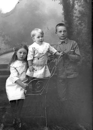 Bildtext: Tröskmanskap hos Henning Gustavsson i Norrby, Rössånger. Från vänster: E J Gustavsson, Per Mattsson, Anna Gustavsson, Helena Jonsson (f Gustavsson), Alfred Norling, Knut Gustavsson, Henning Gustavsson, Per Gustavsson (med pipa), Olle Nordlund (på knä), Henrik Andersson, Per Mattssons mor Anna-Greta, Verner Gustavsson (längst upp), Helmer Norling, Tony Gustavsson, Erik Gustavsson. Barnen i förgrunden är Sven Norling, Anna Norén (f Norling)