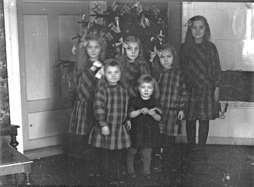 Bildtext: "Hökberg jäntorna" Systrarna Bodin. Här samlade framför en julgran. Namn, ej nämnd ordning. Hilda , Märta, Svea, Elsa, Elin, Signe. se även bild en-j-126 och en-a-35