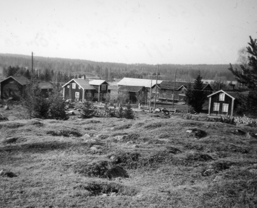 Bildtext: Foto från "tomta" i Hålsänge. Fv Bergmans häbre, "Lars-Hansas = Olle Edströms gård. Th gaveln på skolbostaden, den låg nära landsvägen, och revs på 1960-talet, senast bodde där Gustav och Elsa Johansson med tre döttrar