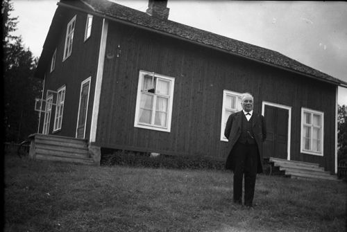 Bildtext: Hanses stuga, Österåcka. Noterade namn: Johan Henrikkson från Kymo, Emil Hansson, Anna Hansson, Adolf och Axelina Henriksson, Ester Westberg