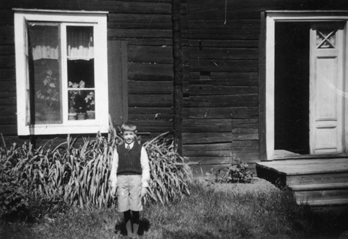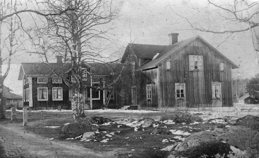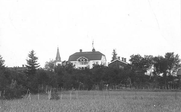 | Bildtext: Enångers prästgård (den nya till vänster, den gamla till höger). Fotograferat från öster, fotograferat sannolikt efter det att tornet på norra sidan byggdes (1904), skymtar under flaggan.