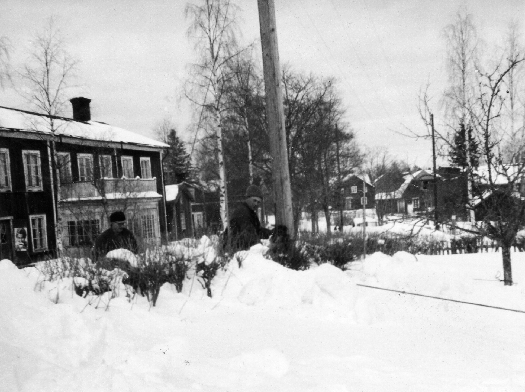 | Bildtext: Två av bröderna Eriksson på Karskär, på väg med strömmingsskötarna för torkning. Fv. Gunnar o Per