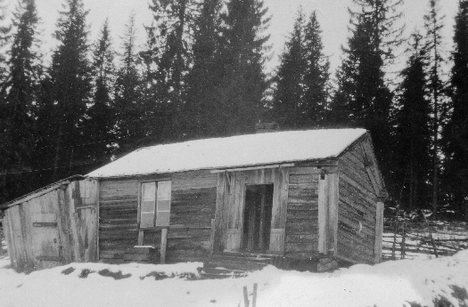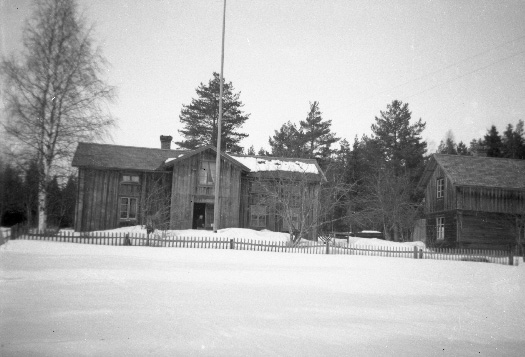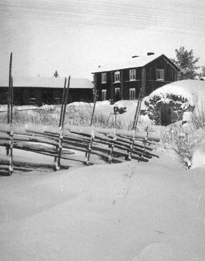 | Bildtext: Fv: Per-Erik Åker, Karl-Hjalmar Åker, Doffner Johansson, Maivor Johansson. I bakgrunden syns fv: gårdarna i Nonå ( Nornå), Malmbergs gård och Missionshuset, sedermera hembygdsmuseum