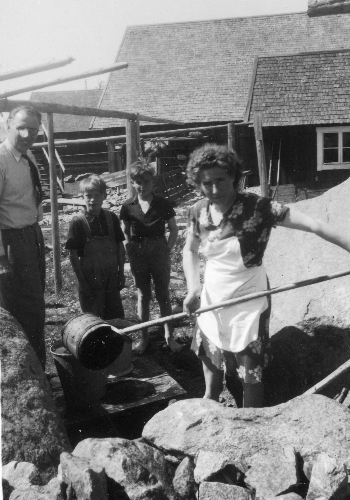 Bildtext: Gunborg Jonsson på Rävelsön tar upp vatten ur brunnen. Hon var gift med "Gladers" Olle Jonsson. Flyttade senare till Vad i Sandarne där de startade rökeri. Pojken till Vänster är Matti, hennes fosterson. Mannen kan vara Anders Svenson