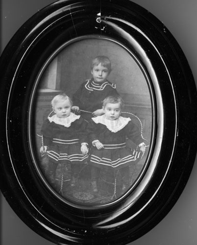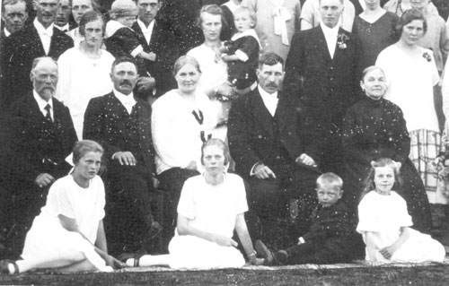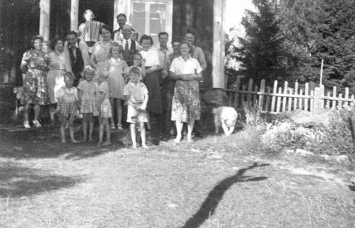 Bildtext: hos Arvid och Hedvig Enström på Bergön. Överst m dragspel Iris Fernlund och Alfred Söderholm. Övriga noterade namn: Anna Söderholm, Arvid, Hedvig, Erik Fernlund. Barnen: Sture Enström, Anita och Ulla Söderholm, Bertil Enström. Hunden Kaj.