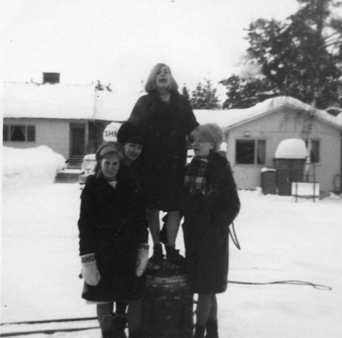 Bildtext: På bron i Wästnång, Finnika. Fv: Kaj Berglund, Lennart Sjödin, Sigrid Westling (i dörröppningen), Kerstin Westling (Larsson), Göta Sjödin och Sven Westlings döttrar Gunilla och Monica