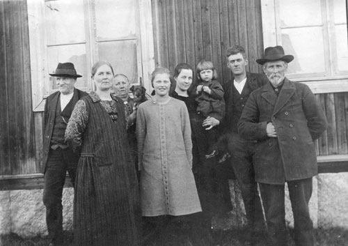 Bildtext: På Bergön. Henning Johnsson, Olle Bergström, Hedvig Enström, Elsa Bergström, Astrid Bergström, Arvid Enström, Eva Enström samt Ville Borin. På trappan till "Mittstugan" som idag ägs av Gösta och Astrid Westling.