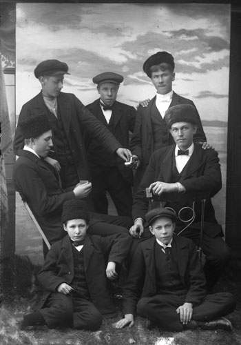 Bildtext: Julhelgssamling runt kaffebordet 1941 i Vedmora. Stånde från vänster; Lars-Erik Svedlund, Gustaf Forsberg(i svart), Evert Lindblom(i vitt,drunknade 1953 i Hedasjön), Eivor Rehnström, Johan Forsberg och Maj-Britt Malmström(fosterflicka hos Svedlunds). Sittande från vänster; Christina Svedlund, Bricken Forsberg, Ida Rehnström, Gunni Rehnström, Axel Rehnström, Kristina Frisk, Astrid Forsberg och Gull-Britt Malmström(fosterflicka hos Svedlunds).