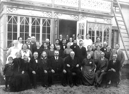Bildtext: Brita Kjellins 70-årsfirande i Vedmora, Enånger. Främre raden fr.v. Erik Norin, Brita-Stina Norin, okänd, Per Norin, okänd, Sven Kjellin, Olov Kjellin, Brita Kjellin, Erik Norin och Lars Brolin. Andra raden; Bricken Mickelsson, Marta Olsson, Evert Norin(bakom Marta), Sally Norin, okänd, Kristina Frisk, Clara Kjellin, Bricken Andersson, Lars Johan Kjellin, Ingrid Kjellin, Marta Norin, Kristina Svedlund och Lars Erik Svedlund. Tredje raden; Selma Norin, ....? Gustafsson, ....? Gustafsson, August Frisk, okänd, Sven Andersson(med skägg), Anna Andersson och Erik Olof Svedlund. Fjärde raden; okänd, okänd, okänd, okänd, Ida Frisk, Karin Svedlund och okänd.