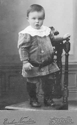 Bildtext: Vid Fjällmyra, Enånger. Elin Egnell, barnen Kerstin och Bruno Svenson, verkar vara en kolmila till höger.