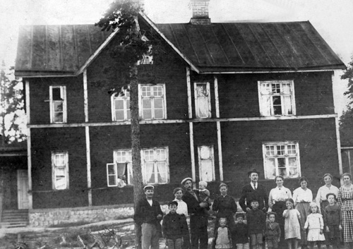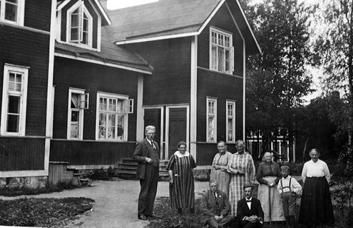 Bildtext: Per Nilssons hem Änga. Per Nilsson i Änga i mitten med käpp. f 1848 d 1932. Till vänster om honom sitter systersonen Nils Olof Engman f 1870 i Änga d 1932. Bakom om Nils Olof står hans hustru Selma f Östby 1882 i Bäckmora. Nils-Olof och Selmas båda barn, Valter och Hilma, står längst bak till vänster. Valter Engman f 1913 flyttade från Änga 1944 till Ingesarven, Bergsjö. Hilma f 1907 gift Sundin i Sätra. I Nils Olof Engmans famn Hilmas dotter Stina f 1925. Nedre raden till höger Erik Mickelsson f 1857 (även kallad Molin) och till höger om Selma Engman, Bricken Mickelsson f 1864.