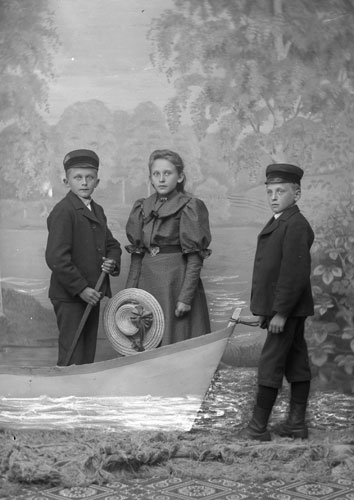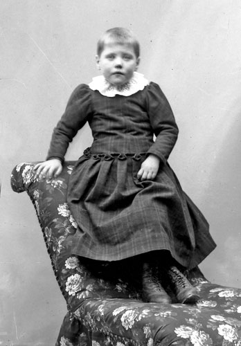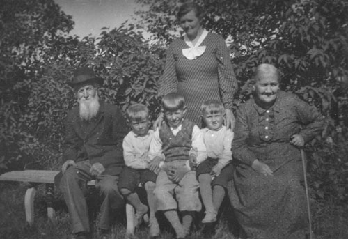 Bildtext: Kusinerna Gösta, Arne, Nisse Westling med sin farfar Mickel samt farmor Brita Christina (Bricken)och stående Arnes mamma Ester. Fotot är taget i trädgården hos Ester i slutet på -30 talet. Info av Arne W