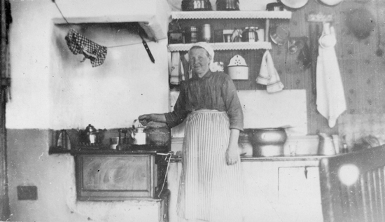 Bildtext: Eliot Burmans notering: Hon tänker servera kaffe, Kristina Bergström, Östby, född Fridlund (1863-1931). Gift mer Anders Olof Bergström. I sitt kök i Östby. På diskbänken står vattenämbaret i förtennd koppar.