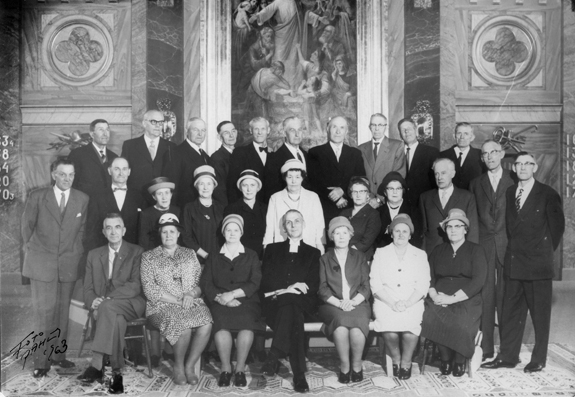 Bildtext: Konfirmandjubileum, Enångers kyrka, 1913 års konfirmander, 50 årsjubileum. Noterade namn: Övre rad 6:e fv Karl Broberg. 2.a rad fv: John Eriksson, Eliot Burman, Kristina Svedin. 2:a rad fh: Melin, Arvid Enström. Främre rad tv: Anders Wedin, i mitten kyrkoherde Hans Persson