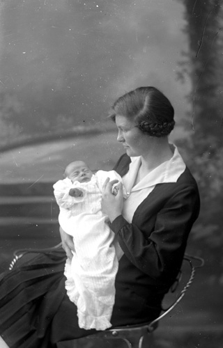 En kvinna med ett spädbarn. Kan möjligen vara Fanny Brolin, gift Bolin med dottern Marianne.