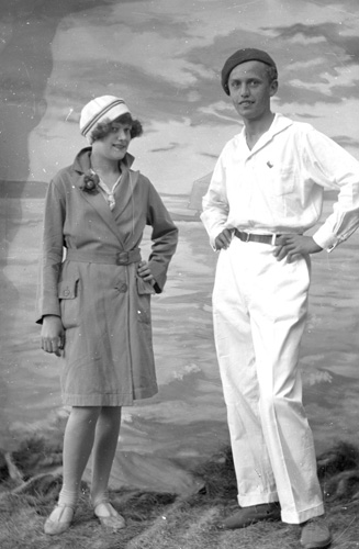 två ungdomar visar dåtidens klädmode. Till höger står Henning Hallberg i Bro. född 1910