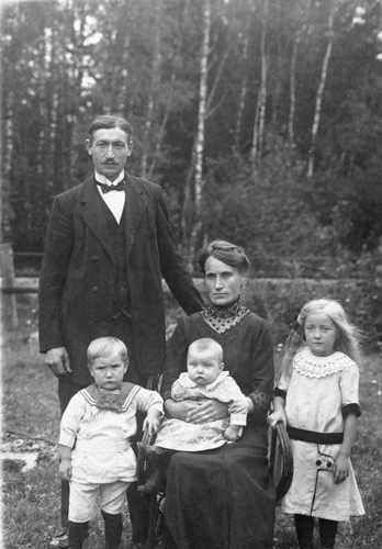 Bildtext: Bilden finns sen tidigare med nummer xx-hbf-17 Bergöns fiskeläge, trappan till Johan Enströms stuga. Överst tv okänd och th Emma Sundin, därefter från vänster, Arvid Enström med sonen Bertil, Alfred Svedlund, Gunborg Svedlund, Florence Wilson USA, troligen brorsdotter till Walter Nilsson, Viktor Sundin, Walter Nilsson från Nilses Staffasberget senare Marmaverken med en dotter i knät. Längst fram, Hedvig Enström med sonen Sture (Uppgifter från Bertil Enström) Personerna på bild har antagligen delvis samröre med bild xx-hbf-57