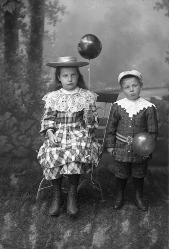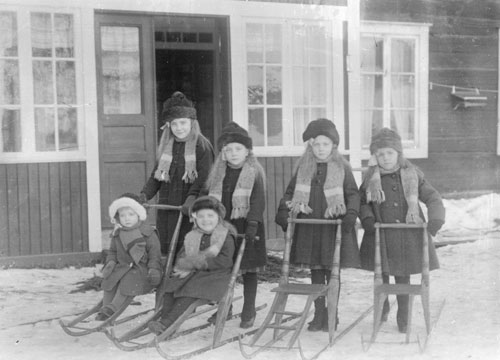 Bildtext: Syskonen Elsa, Fritz och Ruth Söderström, utanför föräldrahemmet i Bäckmora. Föräldrarna var Clara och Per-Johan Söderström. Flickan till höger möjligen en kusin. Se även bild nr: en-r-22 och en-r-89 och en-ah-187 och en-n-135