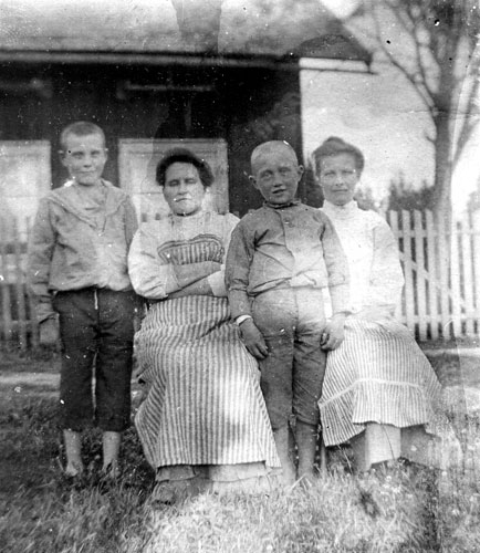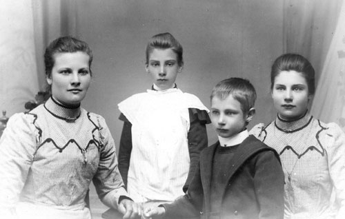 Bildtext: Bjuråker, Tomsjö. Sittande; Hulda Larsson. Fr.v. Elsie Bäcklund, Per Andersson, Gunhild Flodman och Edit Bergman. Släktskapet till bildägaren är; Hulda:mormor, Elsie:mamma, Gunhild och Edit:mostrar.