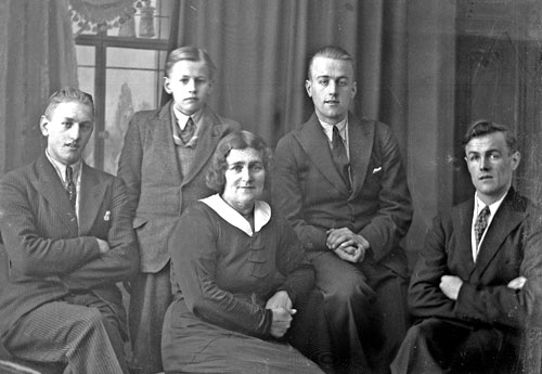 Bildtext: Vedmora 2. Fr.v; Okänd dräng med häst, Gustaf Paulsson(1921-2004)fosterpojk, Kristina Frisk(1877-1957), Ida Rehnström(1902-1990), Eivor Rehnström(1928-2010), och Marta Olsson(1864-1939)fördelsgumma.