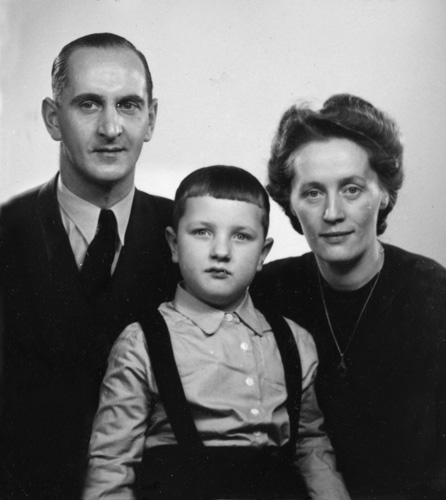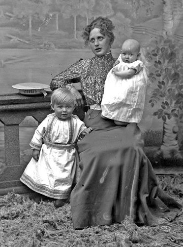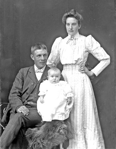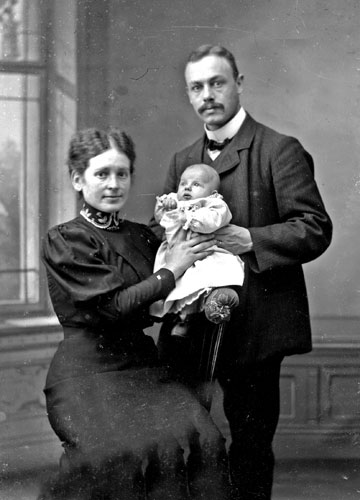 Bildtext: Per Berlin med familj och vänner utanför hemmet i Kyrkbyn Njutånger. Jämför med bild en-l-153. Samt bild nr xnja-348 bland Njutångers bilder