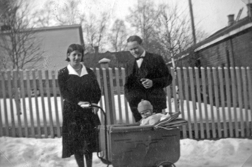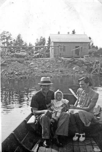 Bildtext: Bertil Molin och liggande, Gunhild Molin med dotter Maritta. Övriga okända, plats okänd