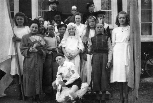 Bildtext: Från Bäckmora skola. Troligen någon form av teater på temat ”olika nationaliteter” med deltagare från flera skolor i socknen. Överst fv: Sig-Britt Fridlund(?), Lasse Hallberg, Rune Johansson. Mellanrad: Anny Sättlin, Märta Persson, Kerstin Svenson, Britta Lindblom, Anny Westlin, Främre rad: Irma Hagberg, Karl-Erik Franck, Karl-Hjalmar Åker, Kestrin Zetterlund, Maj-Britt Westling, Gunnar Brolin, Märta Eriksson. Främst på gåsen Einar Westling. En inkommen bidsynpunkt erinrar sig följande episod kring denna bild: Irma Hagberg (hon med solfjädern) läste föjande: Jag är den lilla körsbärsblomman, fin och rar och nätt. En sådan liten körsbergsblomma har ni aldrig sett.