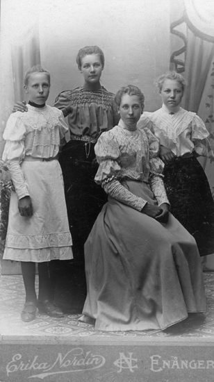 Bildtext: se bild erlwe-08 så borde vara Anna och Märta Jonsson till höger. Sittande till vänster Tonny Andersson Locket Änga stående till vänster skulle kunna vara Hilda Sundström (g. Westberg) Tosätter Namn den som lämnar informationen: Ola Borin sökord: gruppbild motivkategori: porträtt, kvinnor id:16584 Fotograf: Walborg Rosin fotoår: 1910-tal? bildnummer: viviol-06 förening: Enångers Hembygdsförening land: SE motivplats: Gävleborg, Enånger teknik: Inskannat foto rättighet:(föreningen ovan om ej annat anges.) Enångers hembygdsförening originalplats: (visas ej publikt) släktboken: publiceras: ja säljas: ja tidigare nr: samling: Enångers hembygdsförening skick: slitage reg av: HE reg datum: 2026-03-04/2026-03-15 |