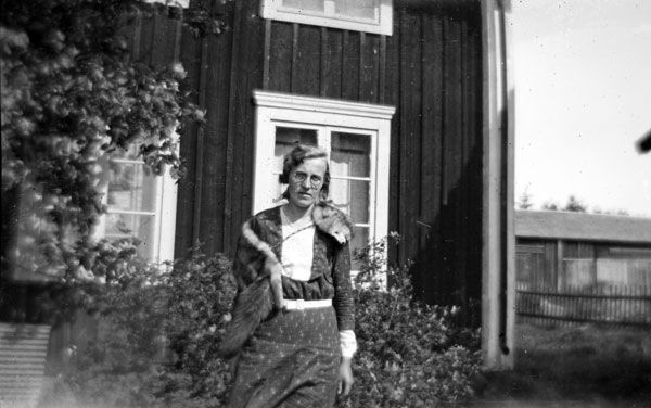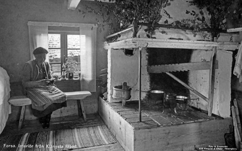 Bildtext: Interiör från Klångsta fäbod, Forsa.Bilden är tagen i köket på Kälkebostugan på Klångstavallen. Idag sitter en vedspis i stugan, men spilelkransen är densamma./Jonas Söderström. Anna Jonsson heter denna kvinna och är mormor åt Ann-Britt Berglund och farmor åt Annika Wallström som bodde i byn Tövsätter där auktionen brukar vara./Jan-Åke Malmqvist