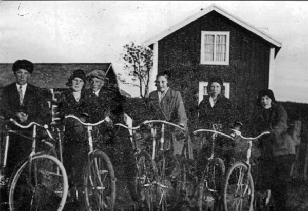 Bildtext: Slåtter Hornevallen Britta Söderström f. Johansson i Matnäs, hennes mamma Hilda Johansson f. Sverin stående från vänster, Drängen Elov, Matnäs Olle, okänd