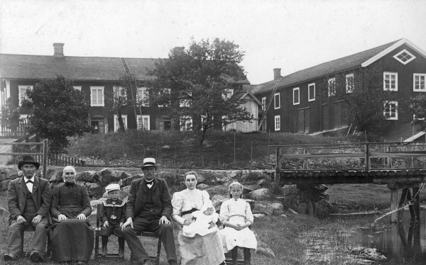 Bildtext: Fr.v Anders Andersson Trolin,Helena Eriksdotter, Anders Westberg f.1907, Hans o Marta Westberg 1885-1920 i knä Karin f.1911, Brita Sverin. Fotot taget Klångsta Bygdegård
