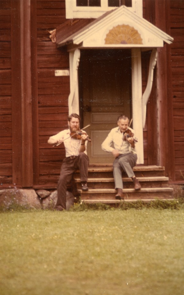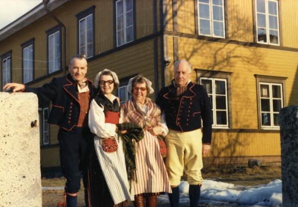 Bildtext: Anna Humbles gård i Åkre. Per Trolin, Marta Trolin, Erik Trolin. Enligt Lars Humble är det inte Anna Humbles hemgård. Det är Lars Nilsson med hustru Brita i mitten (kanske dotter Karin t v om Brita) på sin gård i Flatmo 3. Lars Nilsson var son till Nils Nilsson och Karin Persdotter i Åkre 2 (Ystegårn) och morbror till Anna Humble. Karin Persdotter var dotter till Per Jonsson i Oppigårn, Utnäs 1 och brorson till tidigare bonden Lars Jonsson i Ystegårn i Åkre. Trolins står till vänster.
