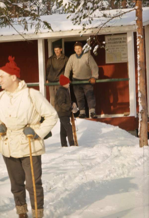 Bildtext: Gökotta vid AnnMarie Hållens stuga på Storberget. De som sitter längst ner till höger är Arne Anderson, Trogsta, dottern Doris gift Eriksson, Flatmo, Anne-Christin Westberg, Stina Anderson, Trogsta, Anne-Margret Westberg, Christa Westberg, Bollnäs, född Clee.