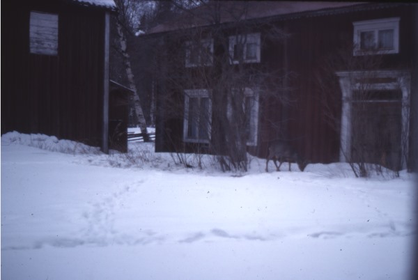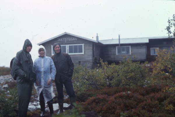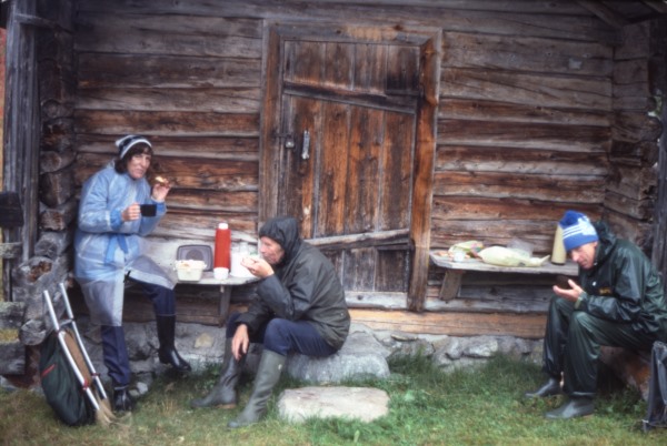 Bildtext: Smedsgårdens stuga på Finnsjövallen. Olof Larsson kisar mot solen.