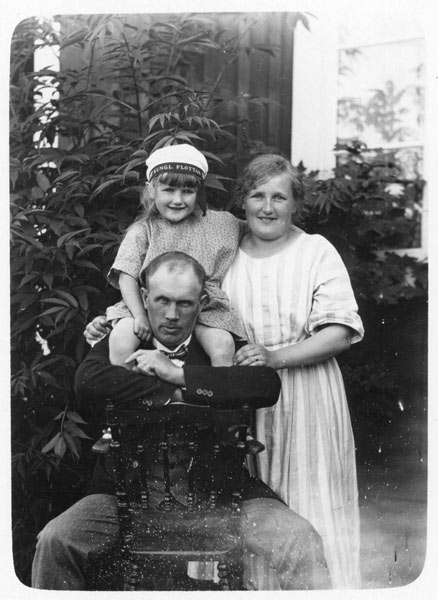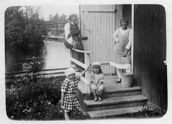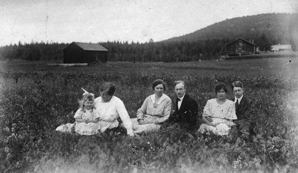 Bildtext: Från vänster: Margot och mamma Anna, Manne och Elma Norrby, Stina och Albin Öhgren och Mormor och Morfar (Sven Persson och Cecilia Jonsdotter) . Alsjövallen? 17 juli 1921