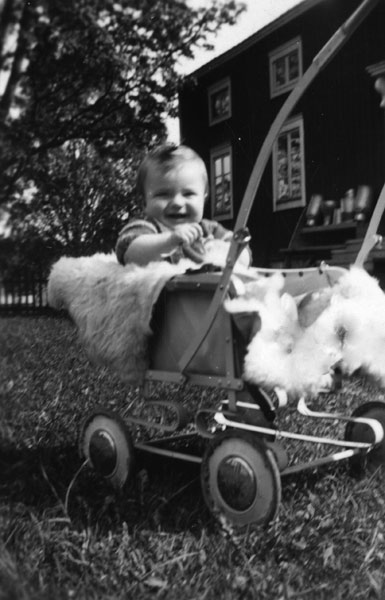 Sökord: barnvagn, staket, mjölkflaskor, fårskinnsfäll