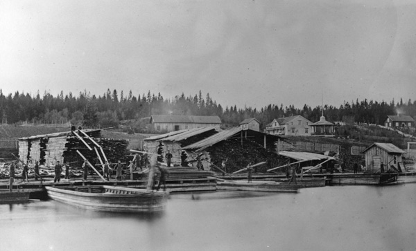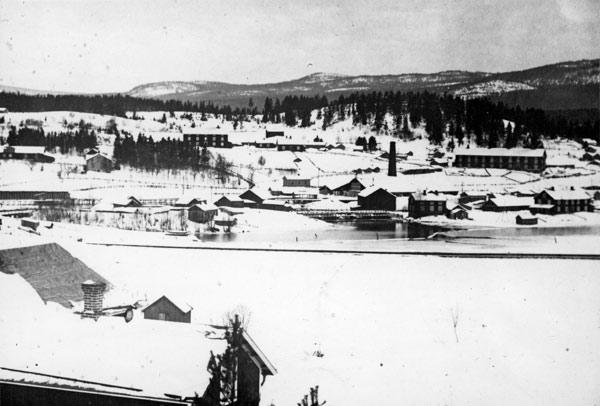 Bildtext: Text till bilden: Forsa ångsåg, brädgård och utlastningskaj på 1860-talet. Bild ur Forsbergs fotos arkiv gamla vyer. Smalspårig järnväg Hudiksvall och Forsa station. Ersatt med statsbanelinje Hudiksvall Ljusdal före 1890-talet.