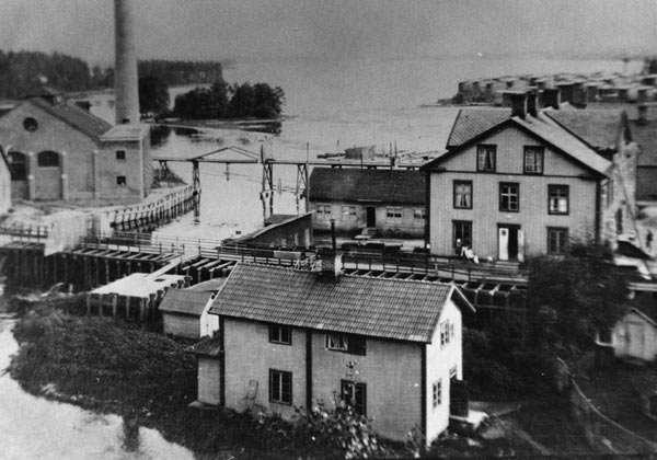 Den så kallade Smedholmen i Lundströmmen. Linspinneriets arbetarlänga (Stor kupa) till höger. Osäker om det är Tuppstugan närmast. I det huset bodde personen som ansvarade för spinneriets ljudsignal (fabrikspipan). Signalen hördes ända till Sunnanbäck om vinden var rätt. // Hans Åke Persson