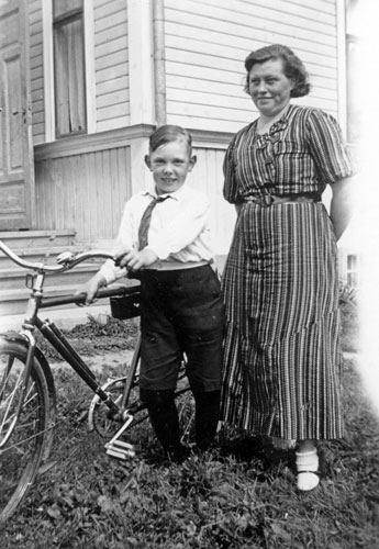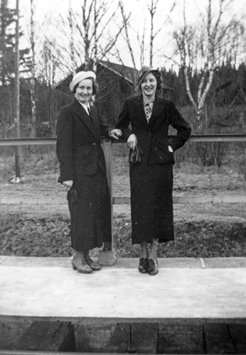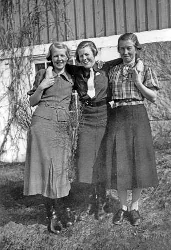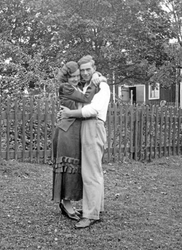 Bildtext: Mejeriet Lund Forsa. Mannen är Mjölnaren Anton Nilsson. Han arbetade i kvarnen till vänster om mejeriet. Kvinnan till höger om Anton är Anna Hallin från Norrviksta, en av mejeripersonalen. Övrig mejeripersonal okända.