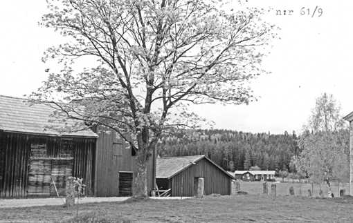 Bildtext: Sågbäcken i Näsviken. Huset längst bort på bild A1-Fränö-61 med omgivningar bl.a. höstackar.