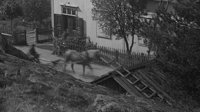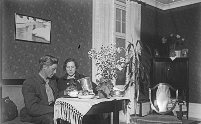 Bildtext: Besök i fäbodstugan i Ofärne sommaren 1923. På bron från vänster: Anders Eriksson (Klångsta), Karin Nilsson (Klångsta), Svan Anna (Bopiga), Märta Eriksson (Lund). I knät: Erik Nilsson (sedermera polismästare i Hudiksvall) I gräset: okänd kvinna.