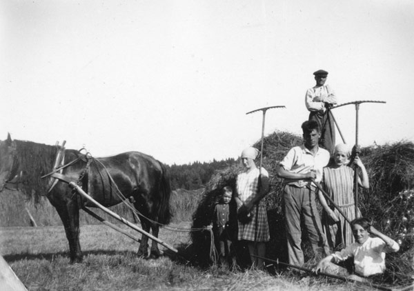 Bildtext: Slåtter 1928. Hästen heter Odin. Från vä: Lill-Johan Olsson, Ester Johansson, Olle Sandström, Svea i Utnäs, Jan-Jans Axel och uppe på lasset Lill-Pelle Per Larsson (kvastmakare) sökord: höbärgning, kratta, lantbruk motivkategori: hästar och folk id:20150 Fotograf: Okänd fotoår: Säkert 1928 bildnummer: LAF-100 förening: Forsa Sockens Hembygdsförening land: SE motivplats: teknik: Inskannad påsiktsbild, 48-bitars färg, 800 dpi, 7,5 X 5,5 cm rättighet:(föreningen ovan om ej annat anges.) Forsa Sockens Hembygdsförening originalplats: (visas ej publikt) släktboken: 5L8, 5L9, 5S6 publiceras: ja säljas: tidigare nr: samling: Lars Fältholm skick: reg av: KO reg datum: 2025-12-22 |